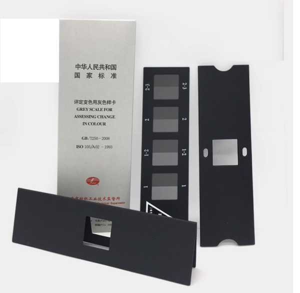 GB/T 250 Grey Scale for assessing Change in color. Compare the origin specimen and finished specimen with the grey scale visually to rating.